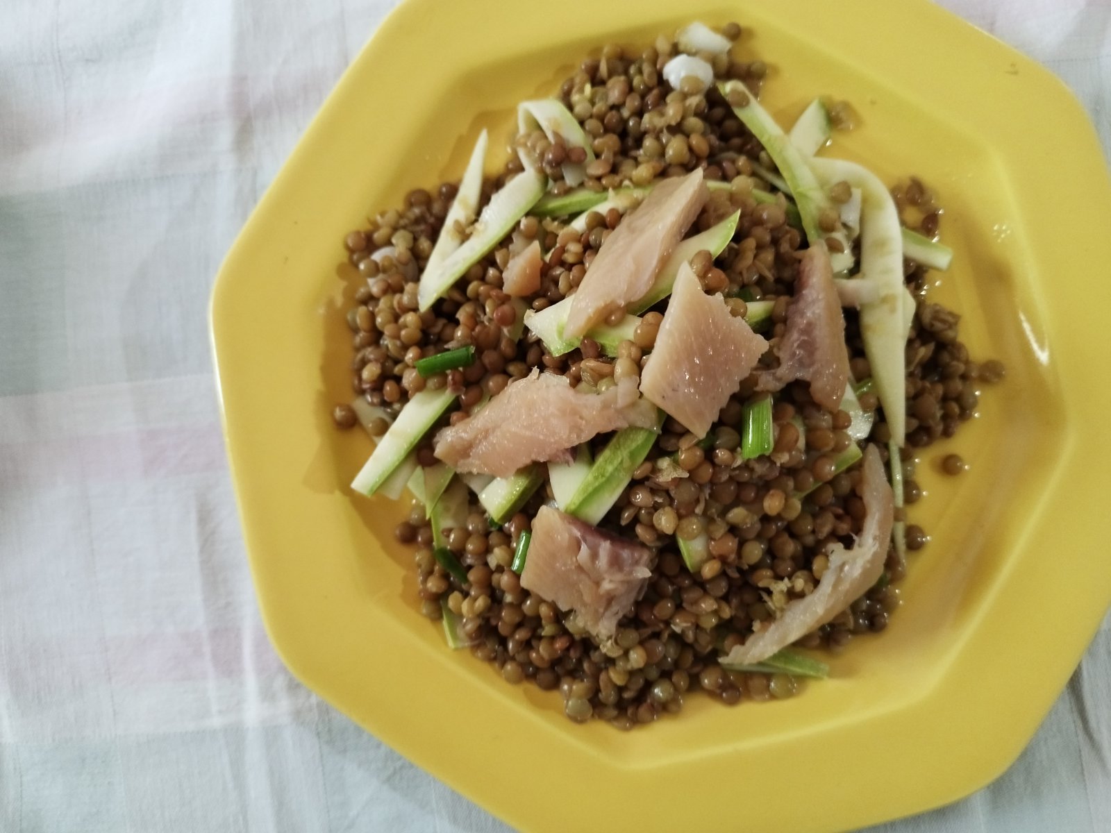 - Σουρώνουμε τη φακή και την κρυώνουμε. Σε ένα μπολ, ανακατεύουμε τη φακή, τα μαριναρισμένα κολοκυθάκια και ψιλοκομμένο κρεμμυδάκι. Σερβίρουμε και τοποθετούμε από πάνω το φιλέτο ρέγκας, περιχύνοντας με τη μαρινάδα από τα κολοκυθάκια. Εάν χρειαστεί προσθέτουμε λάδι, ξίδι ή αλάτι.